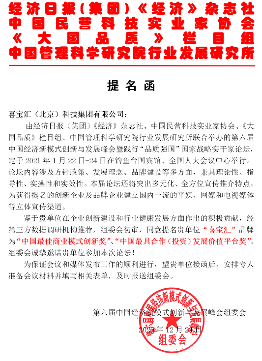 近日,由經(jīng)濟(jì)日?qǐng)?bào)(集團(tuán))《經(jīng)濟(jì)》雜志社、中國(guó)民營(yíng)科技實(shí)業(yè)家協(xié)會(huì)、《大國(guó)品質(zhì)》欄目組、中國(guó)管理科學(xué)研究院行業(yè)發(fā)展研究所聯(lián)合舉辦的第六屆中國(guó)經(jīng)濟(jì)模式創(chuàng)新與發(fā)展峰會(huì)暨踐行“品質(zhì)強(qiáng)國(guó)”國(guó)家戰(zhàn)略實(shí)干家論壇,定于2021年1月22日-24日舉行。本次《第六屆中國(guó)經(jīng)濟(jì)新模式創(chuàng)新與發(fā)展峰會(huì)組委會(huì)》特意提名“喜寶匯”品牌為“中國(guó)最佳商業(yè)模式創(chuàng)新獎(jiǎng)”、“中國(guó)最具合作(投資)發(fā)展價(jià)值平臺(tái)獎(jiǎng)”組委會(huì)誠(chéng)摯邀請(qǐng)貴單位參加本次論壇。